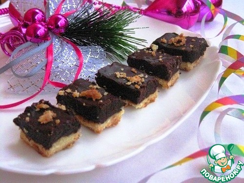 • Шоколадную смесь равномерно распределить по основе, охладить 4 часа. Разрезать на кусочки, украсить по желанию.