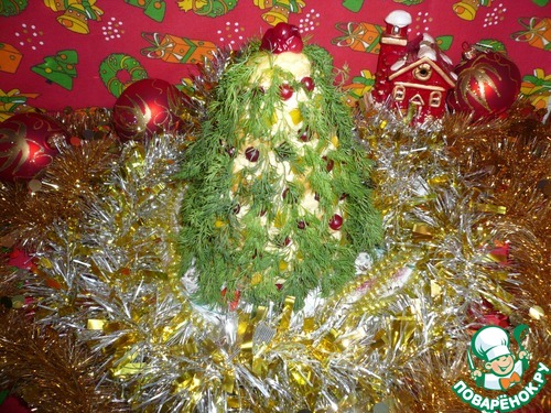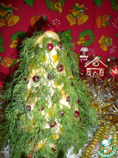 Вот так я “развесила” новогодние игрушки на елку. Делала я их из кусочков перца и клюквы, а иголки из веточек укропа. Вы можете украшать елку на свой вкус.