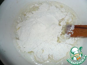 Как только масса закипела, уменьшаем огонь и добавляем просеянную муку.