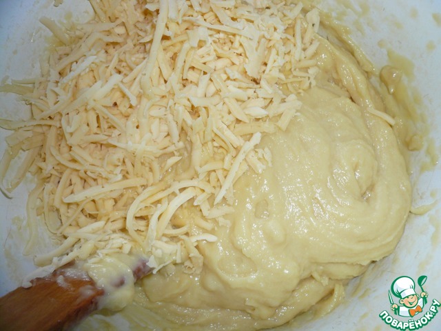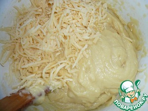 Натираем на терке сыр и добавляем в тесто и перемешиваем.