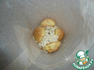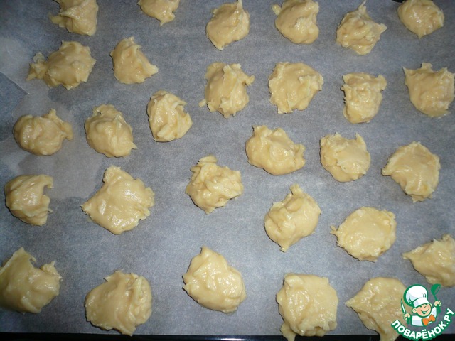 Выкладываем шарики на противень, застеленный бумагой для выпечки. Ставим в духовку выпекаться при t=200 на 25-30мин. Духовку не открывать! У меня вышло 2 противня. Выпекала я в два захода.