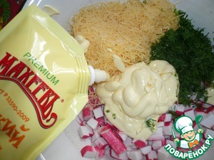 Теперь займемся кремом. В миске соединяем крабовые палочки, сыр, сок лимона, майонез.