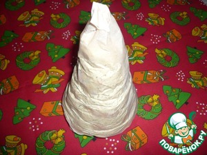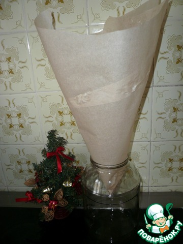 Делаем из бумаги конус и вставляем его в горлышко 3-х литровой банки для удобства формирования елки.
