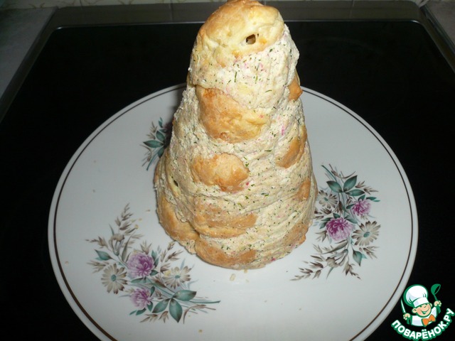 Эта Новогодняя ёлочка станет украшением вашего праздничного стола. Она делается из заварных профитролей и крема из крабовых палочек. Всё очень просто и вкусно. Его можно резать, как торт, а можно разбирать на профитрольки.