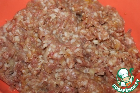 Перемешиваем фарш (у меня говяжий) и отварной рис, солим и перчим по вкусу.