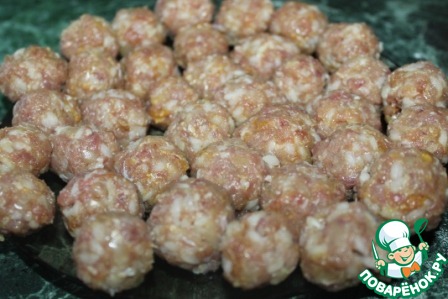 Формируем фрикадельки размером с грецкий орех и отправляем их в морозилку минут на 20 (чтоб удобнее было вдавливать в тесто).