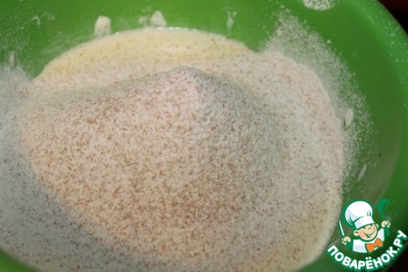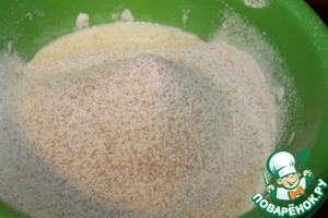Добавляем просеянную муку (оба вида), разрыхлитель и соль.