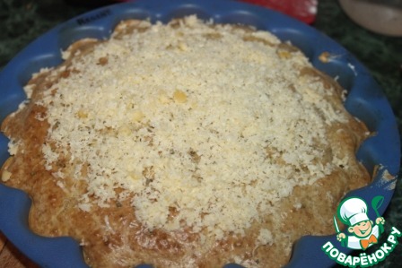Готовый пирог посыпаем натёртым сыром и снова на 5 минут отправляем в духовку (чтобы расплавился сыр).