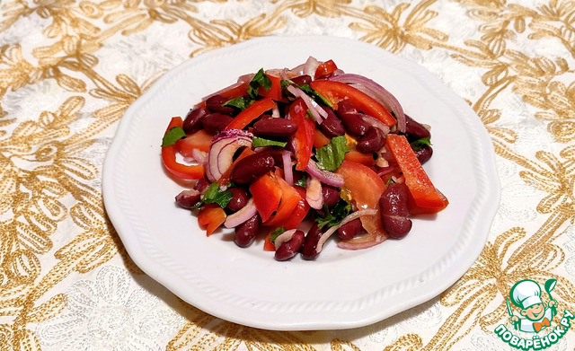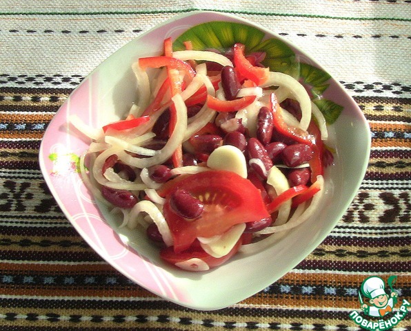 Это поистине яркий и по цвету, и по вкусу салат. Очень сочный, насыщенный ароматами и вкусовыми ощущениями. Нашла рецепт в интернете под названием: салат "Средиземно морский с фасолью", но так как делала его с фасолью "Мехико", то смело переименовала его.