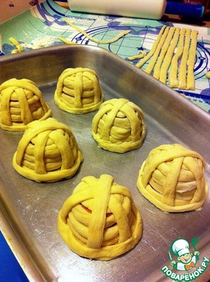 Итак, получаем такие заготовки. Смазываем их взбитым яйцом. Выпекаем при 180 градусах.