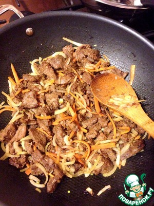 Выложить обжаренное мясо из вока. Добавить в вок оставшиеся 2 ст. л. растительного масла и так же быстро обжарить лук с морковкой, не больше двух минут.