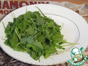 Все слоями. Сначала на тарелку кладём горсть рукколы. -