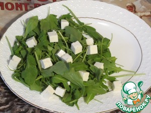 Лосось (у меня форель) нарезать полосками, положить на рукколу с брынзой.