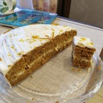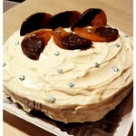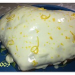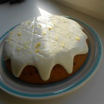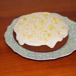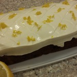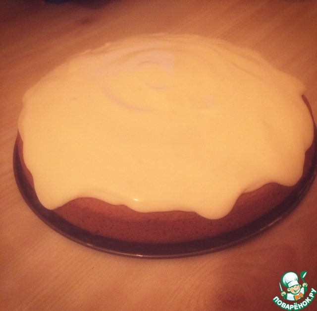 Выложите крем сверху остывшего пирога и разровняйте. Помогите ложкой красиво ему стечь по бокам. Украсьте оставшейся цедрой лимона, а в центр я поставила апельсиновые цукаты.