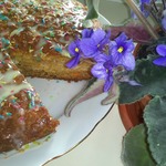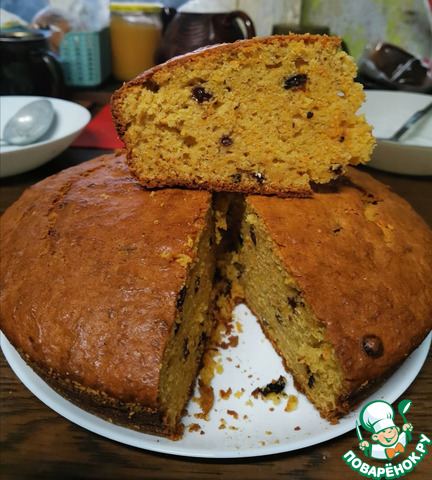 В общем, разрез шикарный, всё пропеклось, кекс высокий, цвет оранжевый, изюм равномерно расположен. На двойную порцию достаточно формы диаметром 26 см, высота бортиков 7 см.
