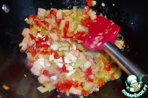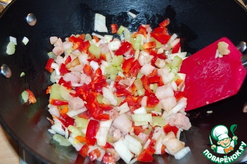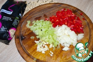 Сельдерей, перец, лук нарезать мелкими кубиками.