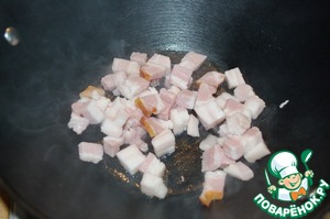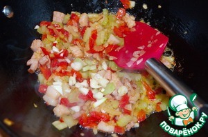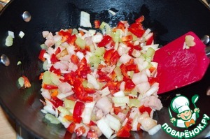 К обжаренному бекону добавить лук, перец, сельдерей и обжарить, пока овощи не станут золотится.
