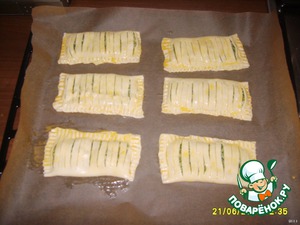 Нарезанный прямоугольный лист теста мысленно разделить на две части и на второй половине, сделать перпендикулярные надрезы.