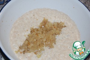 Добавим в опару жареный лук, яйцо, сметану и половину масла.
