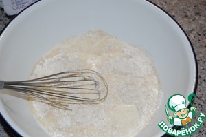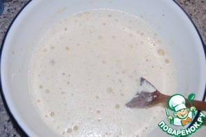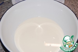 Смесь муки и дрожжей высыпаем в молочную смесь и тщательно перемешиваем. Ставим в теплое место на 30 мин.