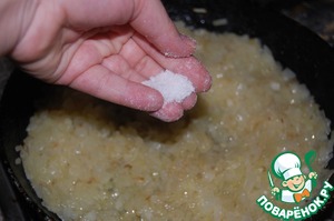 Обжарив лук до золотистого цвета, добавляем по щепотке соли и сахара и стараемся быстренько охладить.