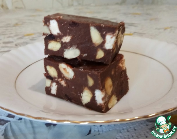 В растопленную шоколадную массу добавить орехи и маршмеллоу, хорошо перемешать, переложить смесь в форму, хорошо разровнять, убрать в холодильник на несколько часов, пока масса не застынет.