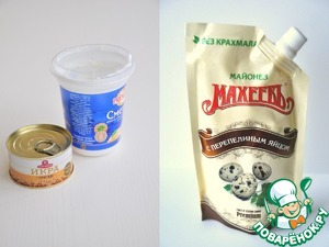 Для икорного соуса нужно смешать икру трески, майонез и сметану в пропорции 1:1. Попробовать на вкус, мне попалась очень соленая икра, пришлось добавить еще немного майонеза и сметаны.
