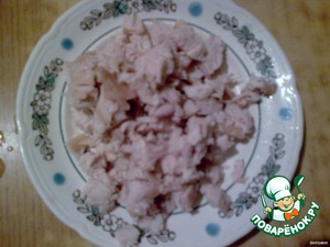 Куриную грудку отварить, остудить и порезать кусочками.