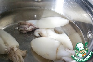 Очистить и отварить кальмары до готовности, не более 3-5 минут в кипящей воде, чтобы они не стали "резиновыми". Остудить.