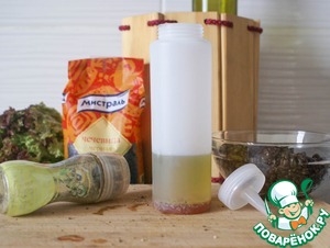 Приготовить заправку "винегрет". Смешать оливковое масло с уксусом в соотношении 2:1, добавить соль и перец по вкусу, по желанию добавить горчицу, энергично перемешать (взбить) вилкой или смешать все в емкости с крышкой - закрыть крышкой и энергично потрясти.