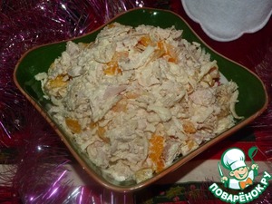 Рецепт салата взят мной в далеком 2001 году из книги "Любимые салаты", автор книги А. Молоховец. С тех пор этот салат очень полюбился, и я его периодически готовлю. Правда, с некоторыми отступлениями от рецепта из книги. В оригинале рецепта сказано, что салат можно готовить с любым мясом птицы. Но нам он больше полюбился именно с курицей. Еще я намного сократила ингредиенты салата - в оригинале в салате должны еще присутствовать: зеленый салат, каперсы и репчатый лук. Да и заправляться салат по автору должен заправкой из желтков с горчицей, уксусом, растительным маслом и специями. Моим домашним больше по вкусу, когда заправляю просто майонезом. В любом случае салат очень вкусный! Рекомендую попробовать! А добавлять ли каперсы, зеленый салат и лук, и чем заправить - решите для себя сами. Я же далее напишу именно как делаю я.