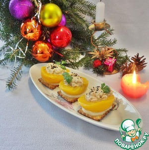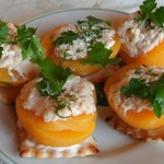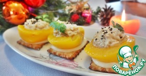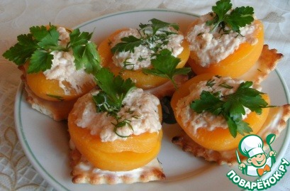 Возьмём несладкие, хрустящие крекеры. Смажем их плавленым сыром и прикрепим сверху нафаршированные персики.