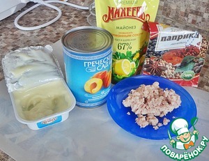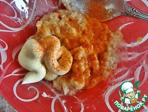 Потом майонез и молотую сладкую паприку. Перемешаем - и вот начинка для наших персиков готова.