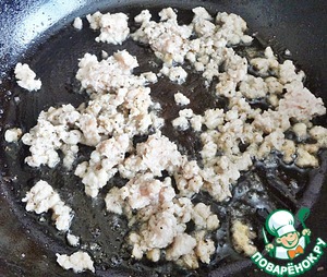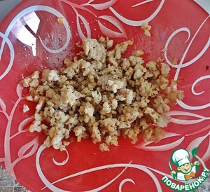 Заполним их приготовленным фаршем из куриного фарша и сыра. -