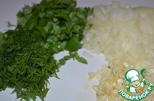 Порезать мелко укроп, базилик (немного оставить для украшения), 1 луковицу и чеснок.