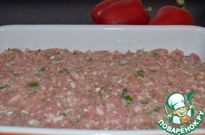 • Форму смазать жиром, выложить в неё подготовленный фарш и немного придавить! Фарш должен хорошо распределяться по всей форме. Форму поставить в заранее разогретую духовку на 15 минут при 225 градусов.