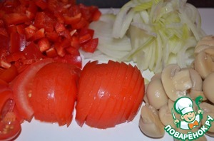 • Порезать полукольцами лук и помидоры. Шампиньоны порезать на половинки, а паприку на квадратики. Обжарить лук на сковороде в 1 столовой ложке подсолнечного масла, добавить паприку и ещё 5 мин. потушить. Добавить грибочки, сметану, соус, соль, перец.