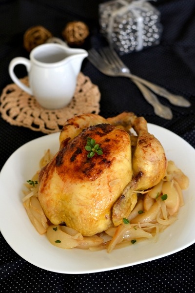 На лук положить курицу, посолить ее по вкусу, залить сидром.