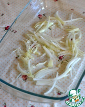 Лук почистить, нарезать на длинные полоски. Выложить в форму для запекания.