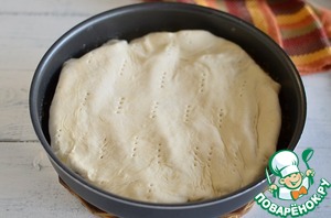 Раскатайте тесто толщиной 5 мм, размером с диаметр формы (22 см). Наколите в нескольких местах вилкой и накройте сверху бананы, подгибая бортики вниз.