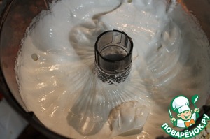 Белки взбить до пышной пены, добавить 270 г сахара и взбивать до устойчивых пиков. Пока масса не станет гладкой и блестящей