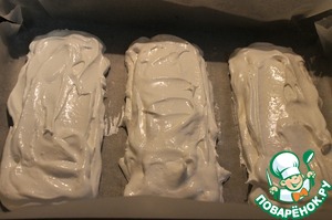 На бумаге нарисовать контур по вашей форме, в которой будем формовать торт. (Мне повезло, все три коржа уместятся на одном противне). И уложить белковую смесь, согласно нарисованным формам, поставить в холодную духовку и сушить при 100*С 2-2.5 часа. Меренги должны при постукивании издавать глухой стук.