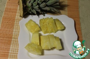 Ананас почистить, нарезать на кусочки. (Мне понадобилось 200 г мякоти). Можно взять консервированный ананас, можно манго или персики