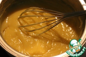 Яичную массу ввести в ананасовую массу, поставить на медленный огонь и постоянно помешивать до загустения крема. Проварить еще пару минут, затем быстро поставить в посуду с холодной водой и продолжать взбивать, пока крем не остынет до комнатной температуры