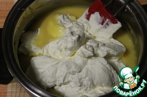 Сливки взбить в пышную массу и аккуратно лопаткой ввести в ананасовый крем