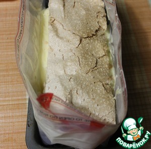 Форму застелить пищевой пленкой. (Моя форма оказалась низковата, и мне пришлось наращивать ее плотным полиэтиленом)