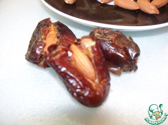 У фиников удаляем косточки и вкладываем миндальный орешек. Орехи я предварительно подсушила в микроволновке. |