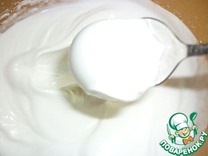 Охлажденные белки взбиваем в крепкую пену, продолжая взбивать, добавляем сахарную пудру и взбиваем еще пару минут до определённой густоты.
