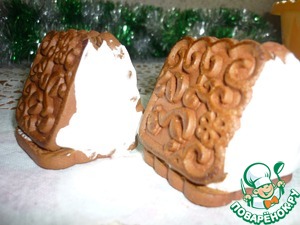 Затем накладываем 2 печенья по бокам, образуя ДОМИК. Печенье нужно хорошо прижать спереди и сзади получившегося домика и выровнять белки ножом.