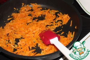 Добавить морковь, натертую на средней терке, и жарить еще 3 - 4 минуты.